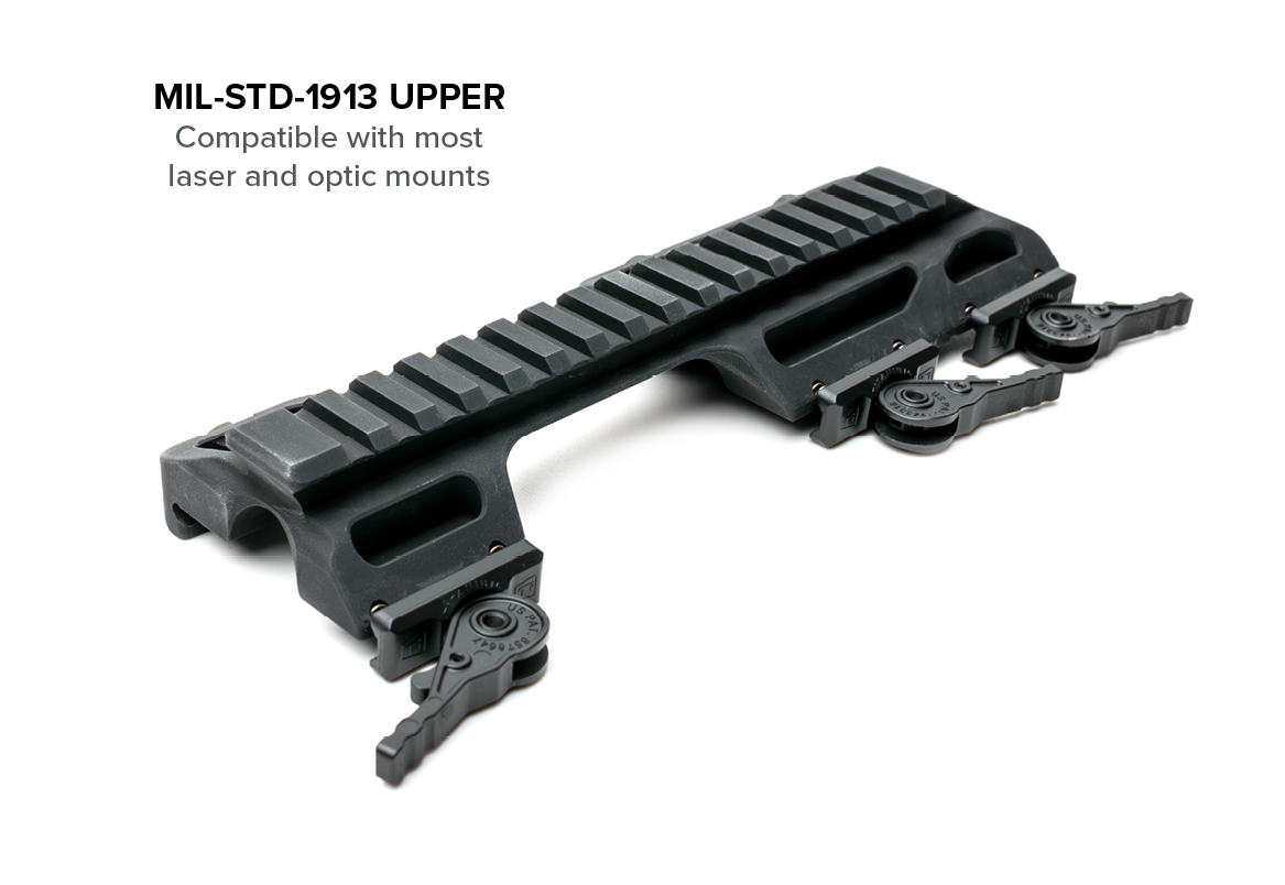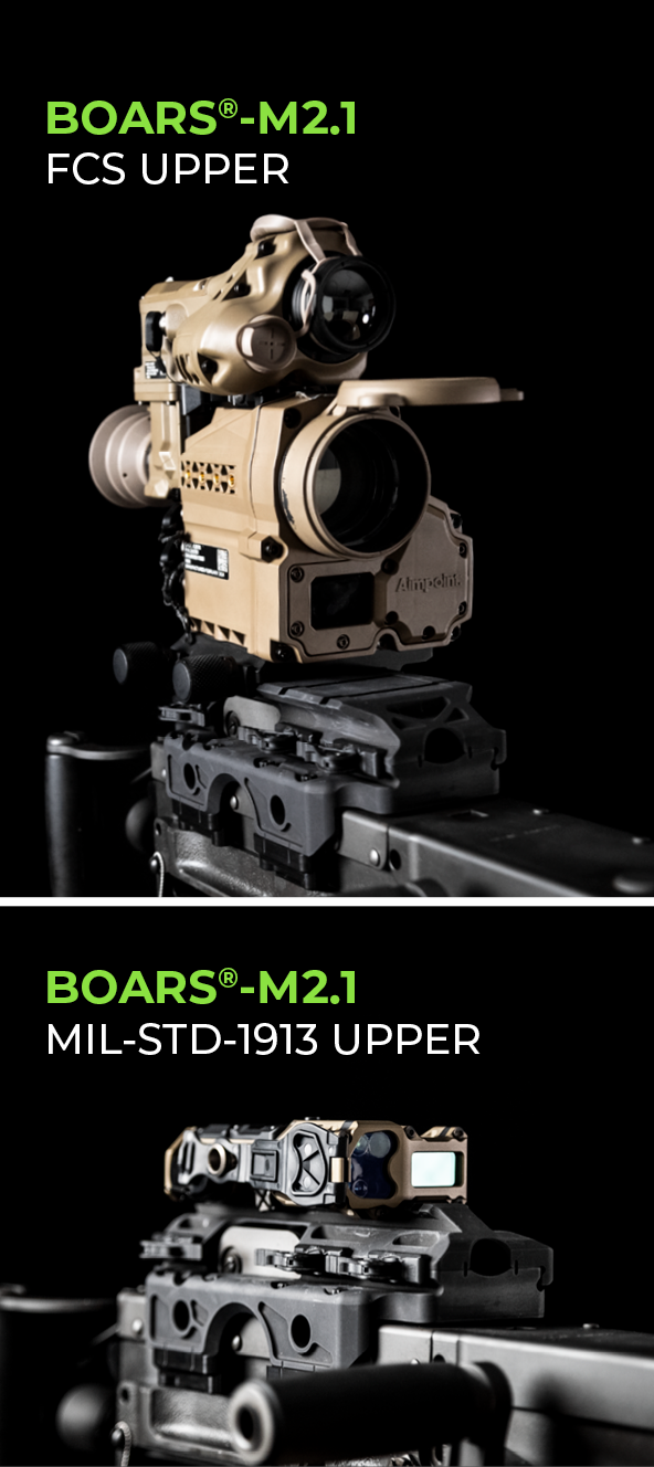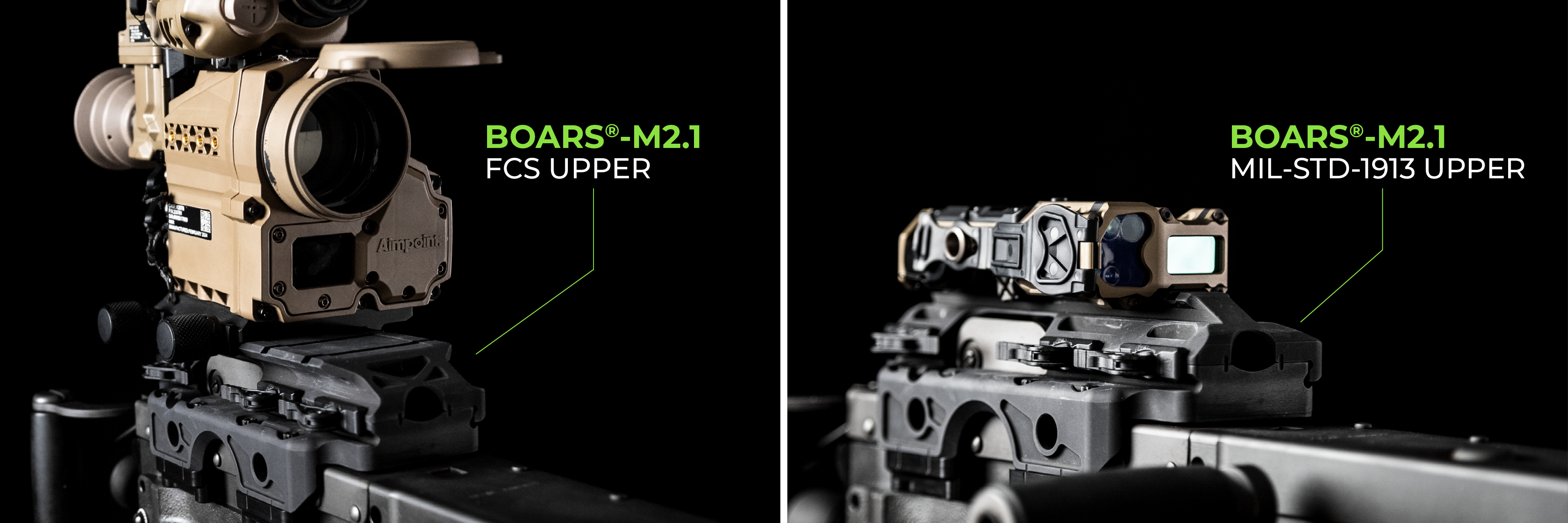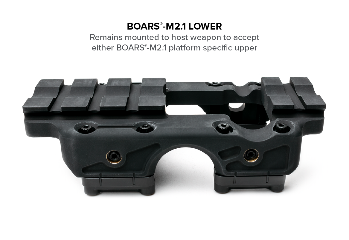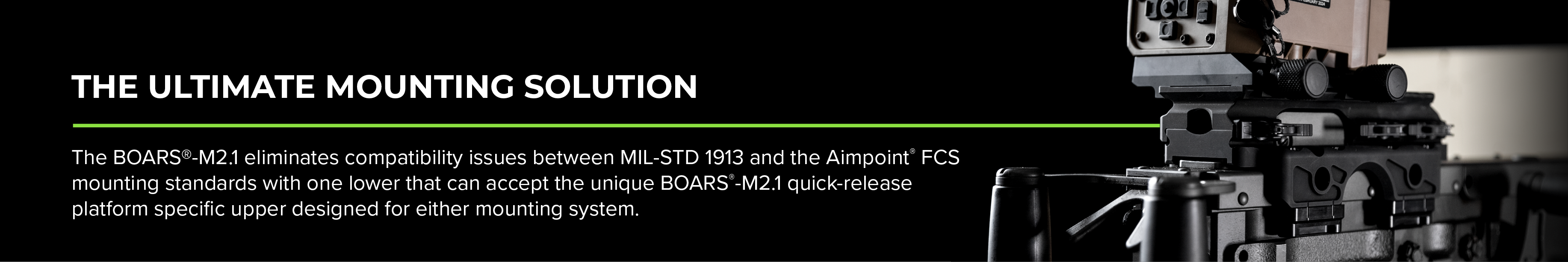 The B.E. Meyers & Co., Inc.™ BOARS®-M2.1 eliminates compatibility issues between MIL-STD 1913 and the Aimpoint® FCS mounting standards with one lower that can accept the unique BOARS®-M2.1 quick-release platform specific upper designed for either mounting system.