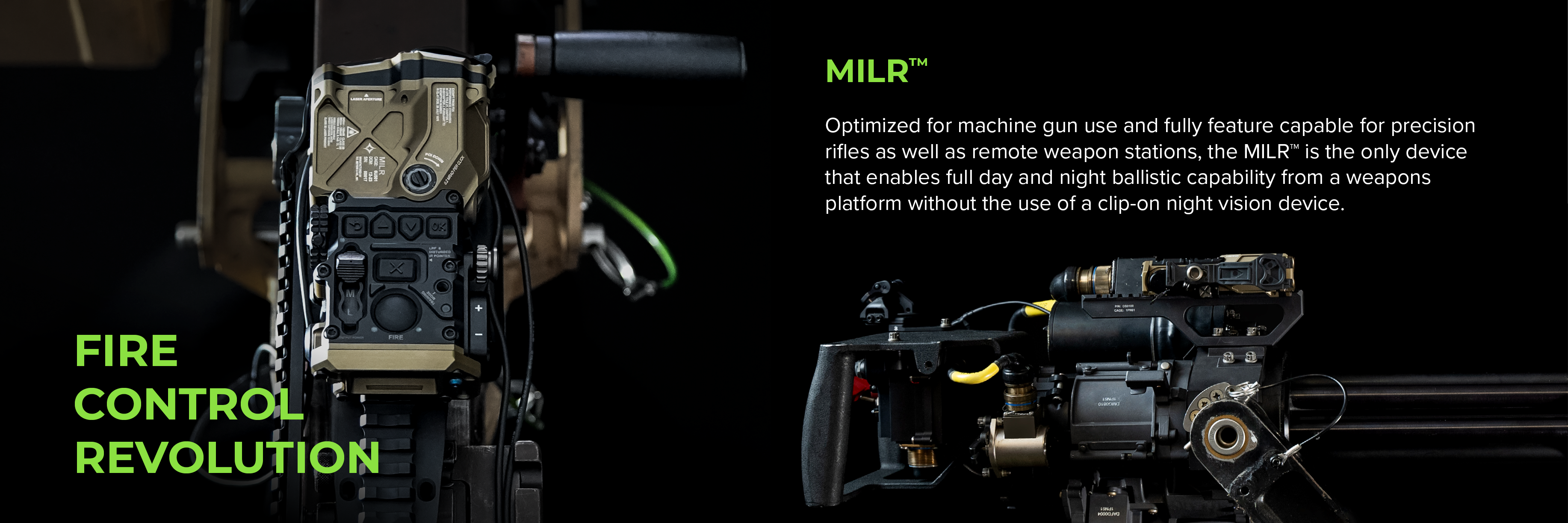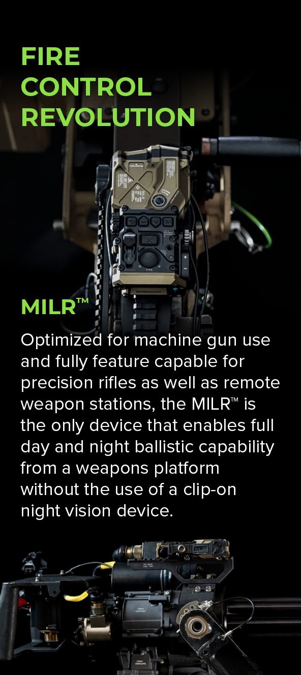 The design and functionality of MILR™ is based on its ability to achieve digital laser movement within the system, specifically the infrared pointer, which internally declinates to create a ballistic solution for the shooter while under NVGs. The introduction of this first Disturbed Infrared Aiming Laser (DIAL™) capability allows for true day-to-night extended-range overmatch for weapons platforms traditionally limited in effectiveness during night engagements. Additionally, the MILR™ uses a step-through ballistic setup interface that provides ballistic computer capability to user groups not previously trained to use a ballistic solver data, while retaining compatibility for traditional long-form profile setups.