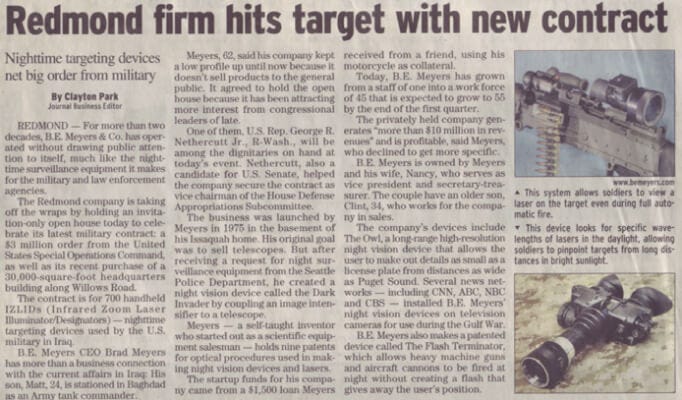 B.E. Meyers & Co., Inc. pioneered electro-optic technologies for military and law enforcement applications. Established by Brad Meyers and Nancy Meyers in 1974, B.E. Meyers & Co. is a privately-owned, mid-sized defense contractor located in Redmond, Washington. Drawing from an experienced high-tech workforce of engineers and production technicians, B.E. Meyers & Co. Advanced Photonics designs and builds high-quality laser-based defense technology products to meet the extreme demands of war-time applications in hostile environments.